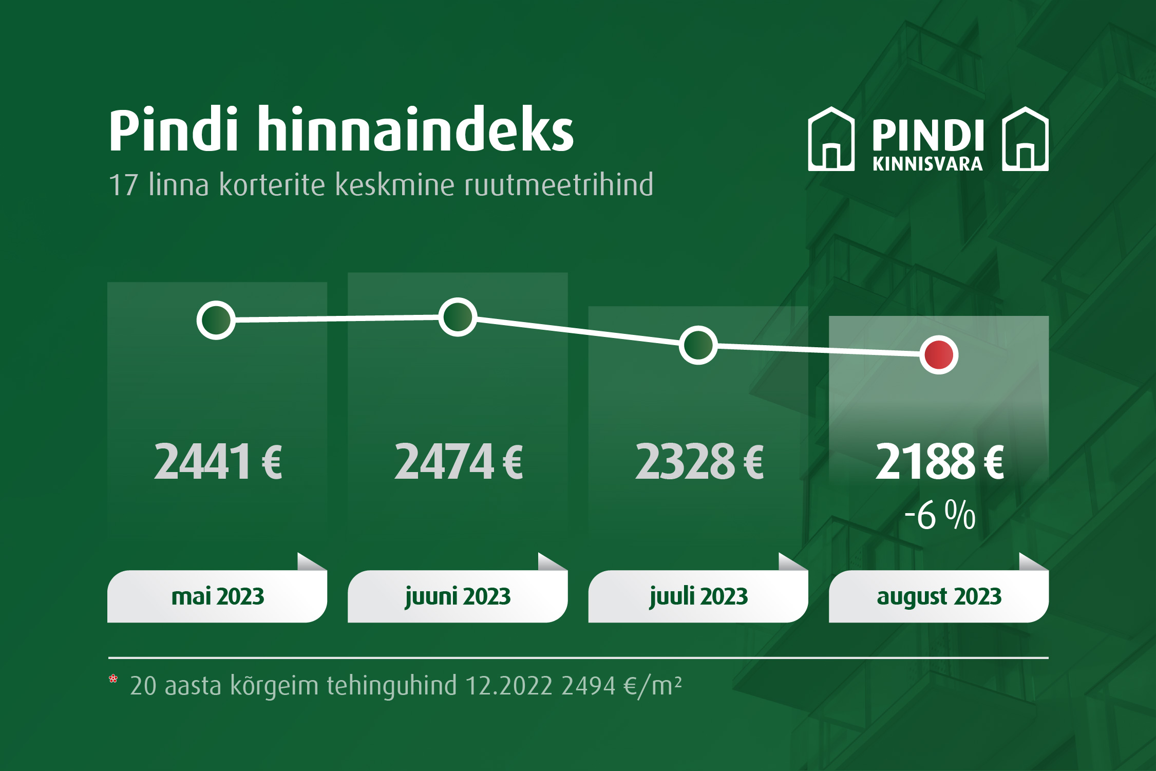 Eesti 17 suurema linna korterite keskmist tehinguhinda kajastav Pindi Indeks langes augustis sarnaselt juulile taas 6% võrra ning jäi pidama hinnatasemel 2188 €/m². Juulis oli korterite keskmist hinda seirav Pindi Indeks korrigeeritud andmetel 2328 €/m².