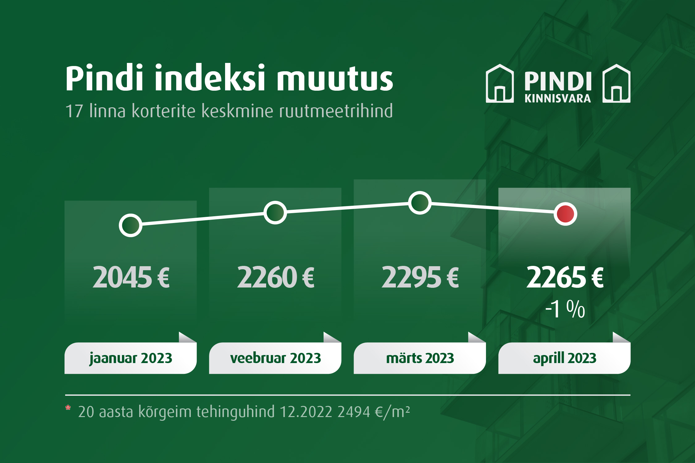 Märtsis oli korterite keskmist hinda seirav Pindi Indeks korrigeeritud andmetel 2295 €/m². Kui märtsis tehti indeksilinnades kokku 1398 korteriomandi tehingut, siis aprillis oli tehingute arv 1170. Võrdluseks – 2022. aasta aprillis tehti indeksilinnades 1477 korteriomandi tehingut.