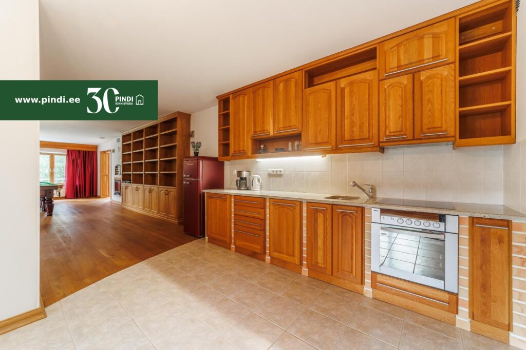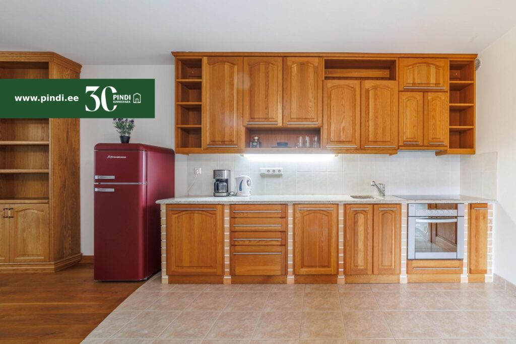 Köögi osas külmik, integreeritud elektripliit ahjuga, õhupuhastaja ning nõudepesumasin.