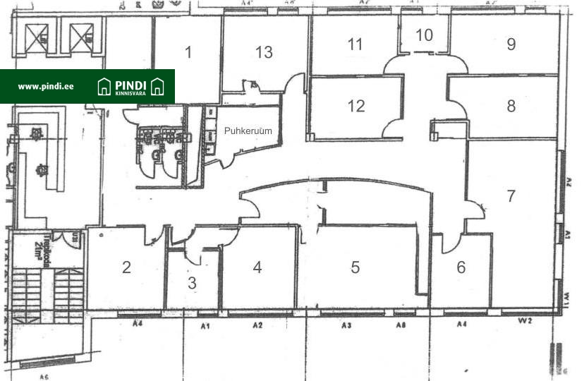 Kontoriruumid (numbrid lisatud joonisele) – üürihind 7 €/m²
