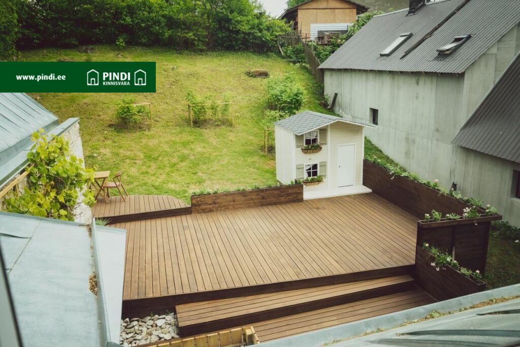 L-kujulise hoone sisehoovis on äärmiselt mõnus tuulevaikne terrassiala, kus juba esimese kevadpäikesega on mõnus aega veeta.
