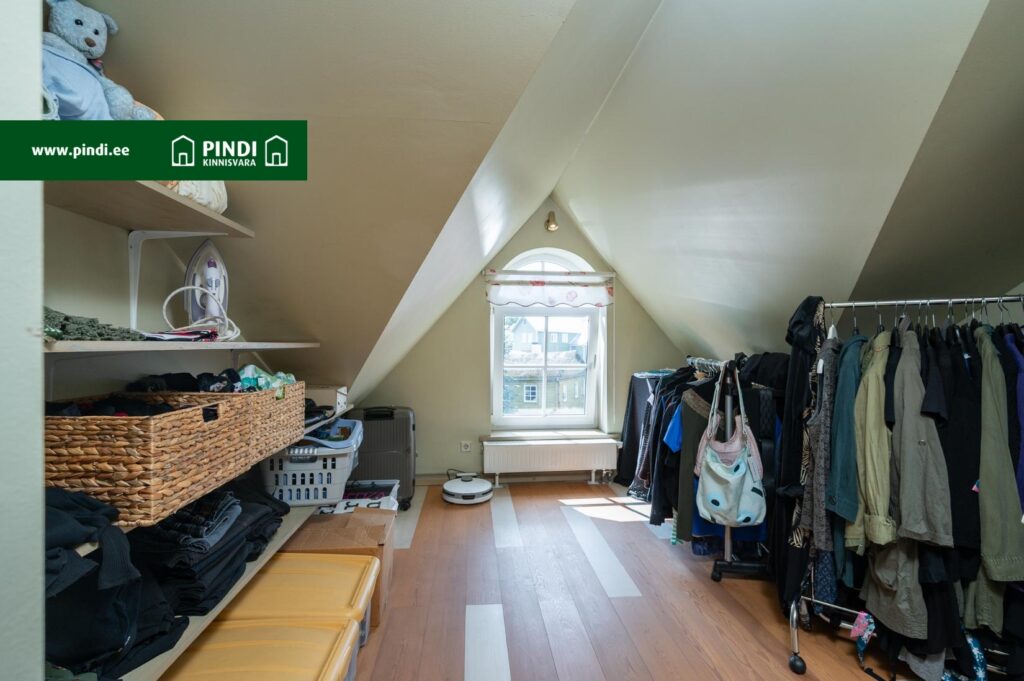Kabineti kõrval asub garderoobiruum, kus avatav aken tagab loomuliku valgustuse ja tuulutuse.